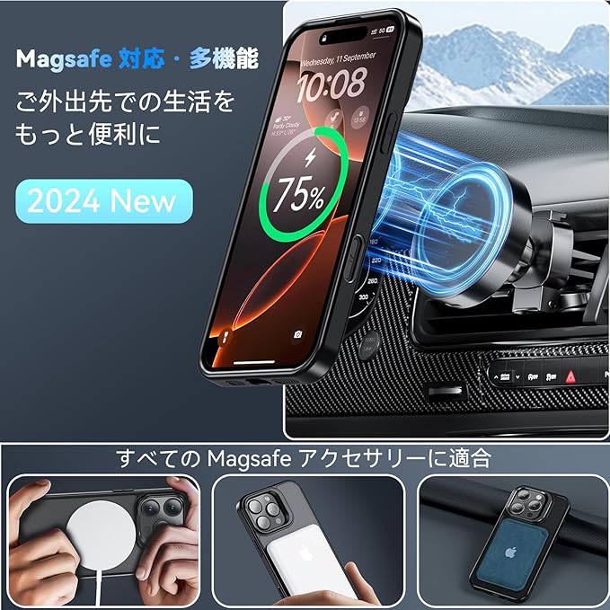 【MagSafe対応&スタンド機能】ケース内部には2024年に新開発された強力なマグネットが搭載されており、吸着力と安定性が向上し、MagSafe充電対応で差し込みのいらない超簡単・超高速充電を実現しています。MagSafe対応アクセサリーもいろいろな iPhone 16 Pro Max ケース!また、カメラの外枠は頑丈なアルミニウム合金材料を用いて開閉しやすい支持枠を作り、スタンドの機能を与え、お好きな角度を調整でき、両手が解放され、いつでもどこでも動画視聴便利です。