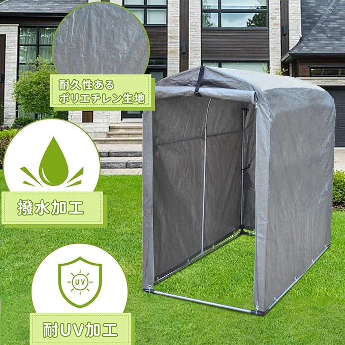 防水性:カバーには前方に入り口があり、自転車の出し入れが容易です。ファスナーを閉めると密閉されたガレージになります。雨や雪から自転車を守るために、撥水加工されています。これにより、自転車などを湿気や水から守り、長期間の保存に適しています。