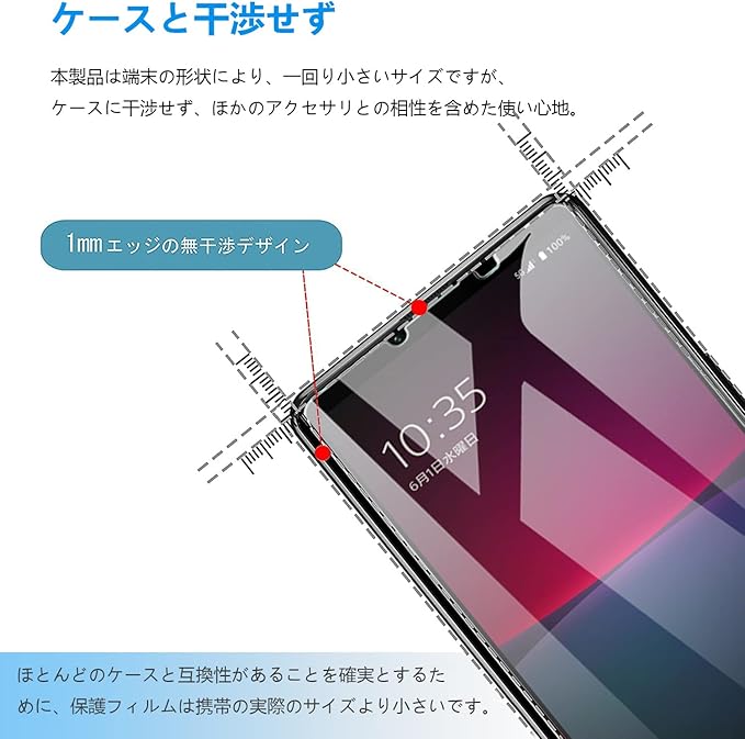 ☀専用保護フィルム-99%の保護ケースに干渉しない:らくらくスマートフォン エクスペリア10 IV の画面はラウンドエッジ加工を採用しております。保護フィルムの脱落と浮きを防ぎ、スマホケースの取り付けに影響を与えないために 、側面は画面のサイズよりも少し小さくなります。※注:これは不良品ではなく、上記の構造に従って設計されています。 ご理解の上ご購入ください。