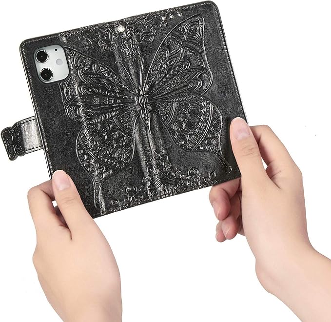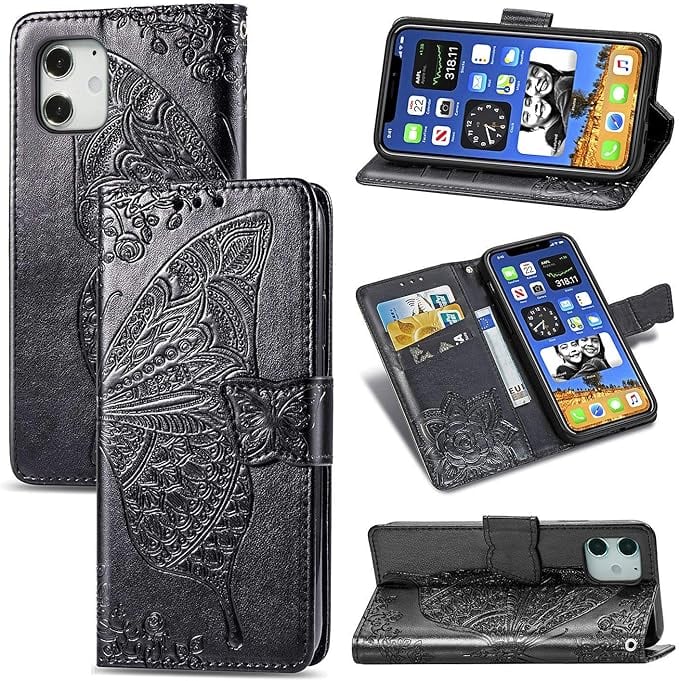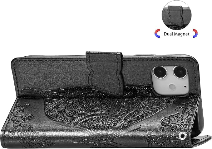 に適用するiPhone 12 miniケース 手帳型 ノートブック型携帯電話保護カバー多機能携帯電話ホルスター財布携帯電話ホルダーバンプパターンテクスチャ耐久性摩擦耐性携帯電話ケース男性と女性に適した多色オプション (バタフライ黒)
