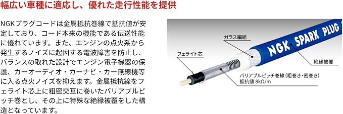 ■NGKプラグコードは金属抵抗巻線で抵抗値が安定しており、コード本来の機能である伝送性能に優れています。