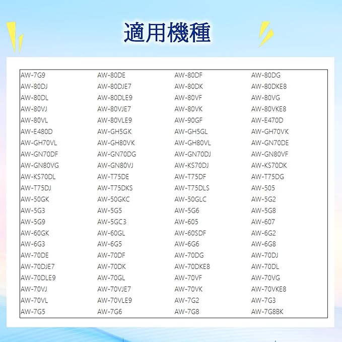 対応機種:AW-7G9 AW-80DE AW-80DF AW-80DG AW-80DJ AW-80DJE7 AW-80DK AW-80DKE8 AW-80DL AW-80DLE9 AW-80VF AW-80VG AW-80VJ AW-80VJE7 AW-80VK AW-80VKE8 AW-80VL AW-80VLE9 AW-90GF AW-E470D AW-E480D AW-GH5GK AW-GH5GL AW-GH70VK AW-GH70VL AW-GH80VK AW-GH80VL AW-GN70DE AW-GN70DF AW-GN70DG AW-GN70DJ AW-GN80VF AW-GN80VG AW-GN80VJ AW-KS70DJ AW-KS70DK AW-KS70DL AW-T75DE AW-T75DF AW-T75DG AW-T75DJ AW-T75DKS AW-T75DLS