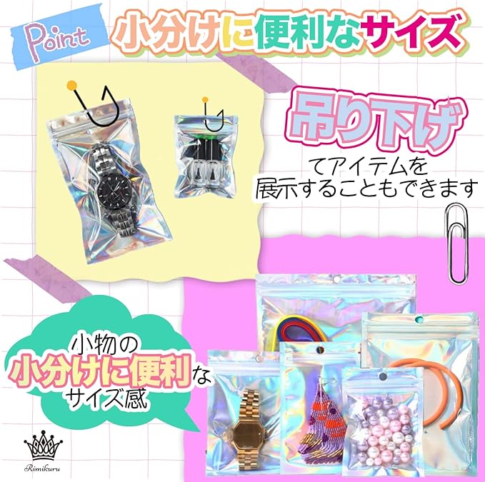 小分けに便利なサイズ:適度な大きさのオーロラ チャック袋になっておりますので、小物の小分けに便利なサイズとなっております。穴が空いている仕様なので、吊り下げてアイテムを展示することもできます。