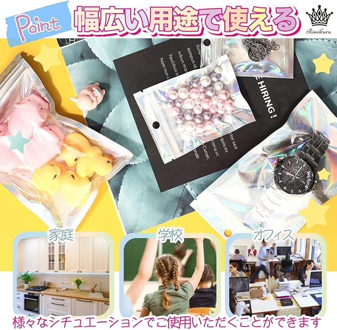 幅広い用途で使える:こちらのオーロラ チャック袋は小物やアクセサリーなど様々なものを整理・収納できるので家庭や学校、オフィスなど場所を問わず様々なシチュエーションでご使用いただくことができます。