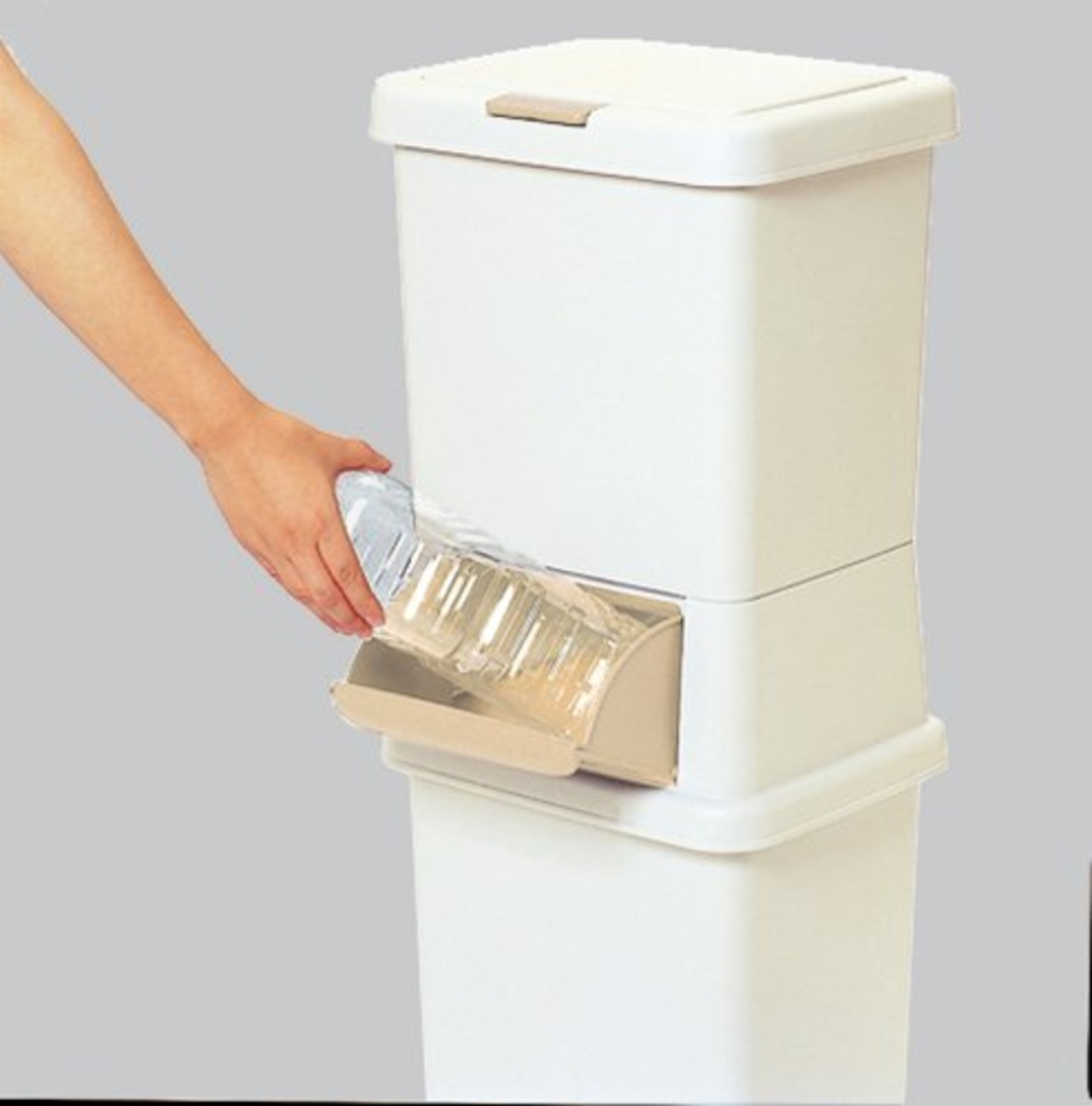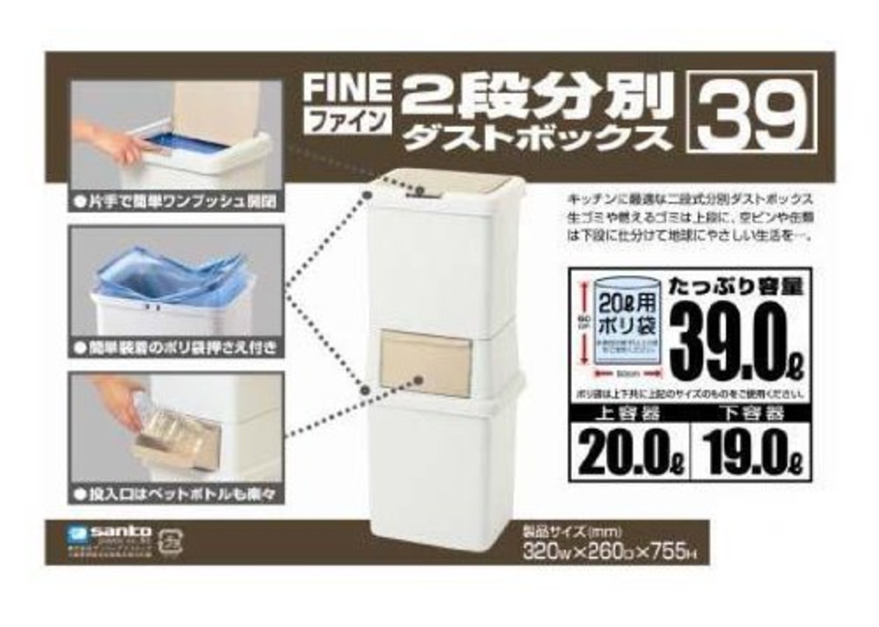 積み重ねて二分別できる省スペースダストボックス。上段はボタンを押してワンプッシュで開閉、下段は前開きタイプ。袋の装着がラクにできるポリ袋押さえ付き。安心安全の日本製。
