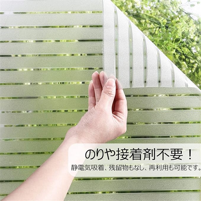 ガラスに残り無し・初心者でも簡単:接着剤を使わず、水だけで貼り付けられる静電力付着タイプなので、跡を残らず剥がせるし、何度でも貼り直せます。初心者の方でも簡単に貼ることができます。レンタルオフィスや賃貸には最適。ただし、一つご注意!凹凸ガラスだと静電力が発生できないので、表面が滑らかで平らなガラスにだけご使用をお願いします。