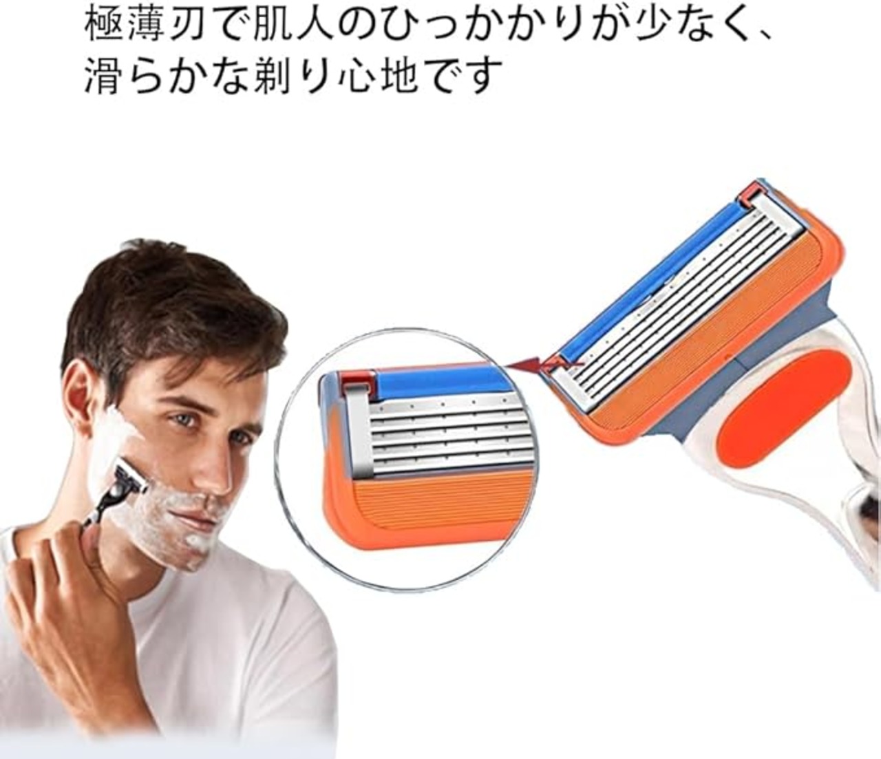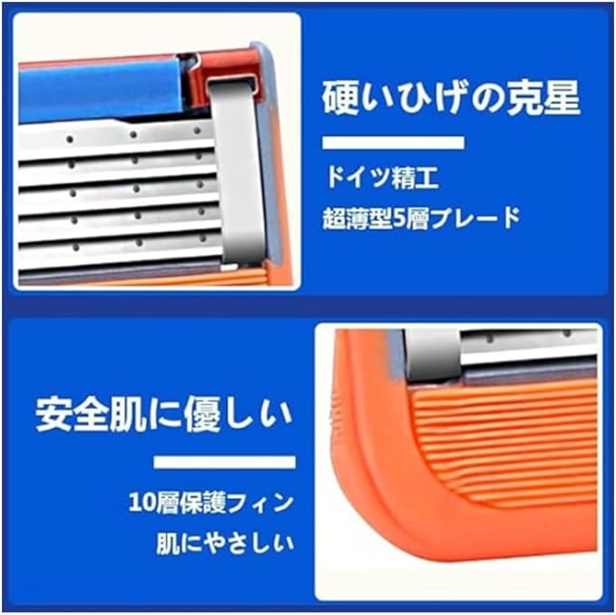 ジレットフュージョン互換替刃 8個入(オレンジ)特徴:高精度5枚刃+潤滑ストリップ:ステンレス鋼製の5枚刃と1本の潤滑条で、肌に優しい滑らかな剃り心地を実現。シェービングクリームがなくても快適に使用可能。全フュージョンシリーズ対応:ジレットフュージョンシリーズのすべてのカッターヘッドと互換性があり、手元のホルダーに簡単装着可能。衛生的で長寿命:錆に強く水洗い可能。定期的な交換(目安:1ヶ月に1回)で常に清潔で鋭い剃り味を維持。簡単交換システム:専用ホルダーにカチッと装着できる設計で、1秒で刃の交換が完了。ご注意:※本品はジレット純正品ではなく、ジレット社のライセンス/承認を受けた製品ではありません。ジレットフュージョン用互換替刃としてご利用いただけます。パッケージ内容:替刃 8個(オレンジカラー)常に最高のパフォーマンスを発揮するために、刃の定期的な交換をおすすめします。磨耗した刃の使用は肌トラブルの原因となる可能性がありますのでご注意ください。