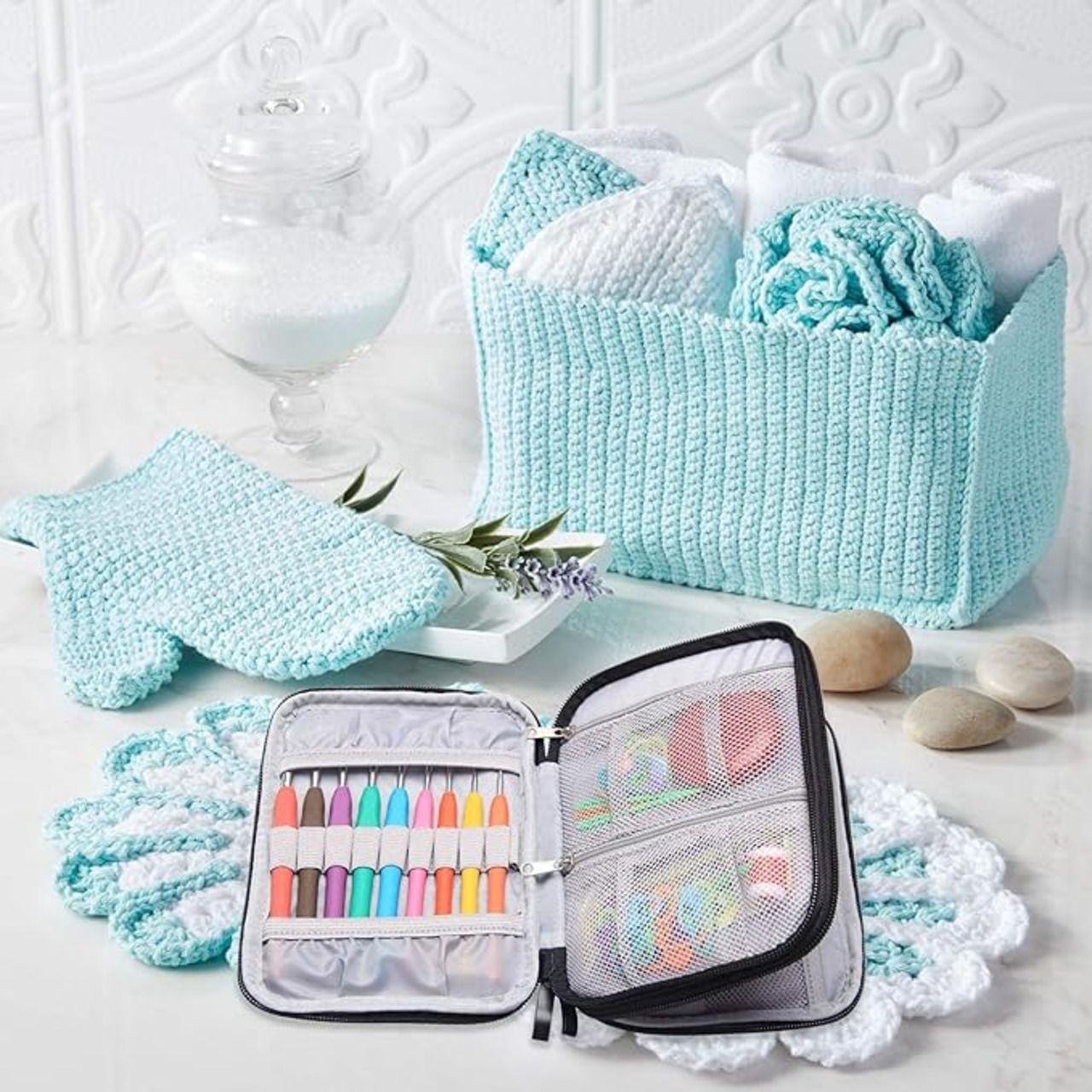 かぎ針編みに必要なかぎ針セット、アクセサリー(小さいはさみ、定規、段数マーカー、とじ針など)の保管と持ち運びに便利な収納ケースです。
