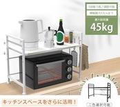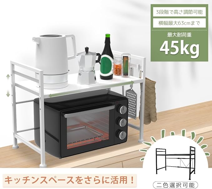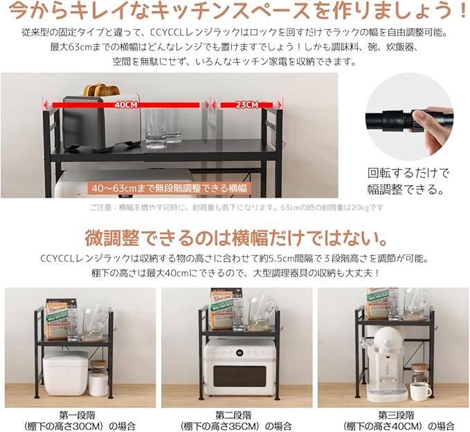 【伸縮設計でスペースを有効活用】:可動棚板は約5.5cm間隔で3段階で高さ調節可能で、約幅40cm~63 cm(内寸)で無段階調整できます。自分の好みに合わせて自由にアレンジできます。電子レンジだけでなく、ジューサーや湯沸かし器などの小型家電にも応用できます。1つの製品でキッチンの空間が整頓され、レンジの大きさや収納物の量、置く場所の広さなどに合わせたご家庭のキッチンにちょうどいい形で設置していただけます!