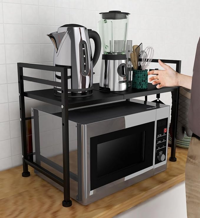 【製品仕様】:※に注意:ネジやほかの部品が不足している場合は、再発行に連絡してください。サイズ:(40~63cm)*奥行32cm*高さ47cm 素材:スチール(焼付塗装) / ABS樹脂。キッチンラックの収納空間は大きく増加できます!電子レンジやその他のキッチン用品に最適です。
