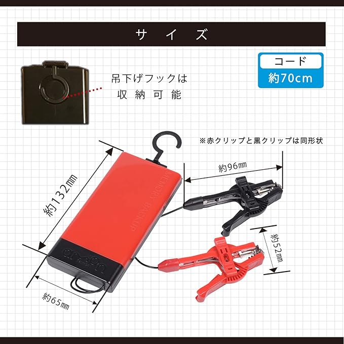 しっかり挟んで外れにくいクリップ(クリップ開口部:MAX25mm)・エンジンルームに吊るせるフック付