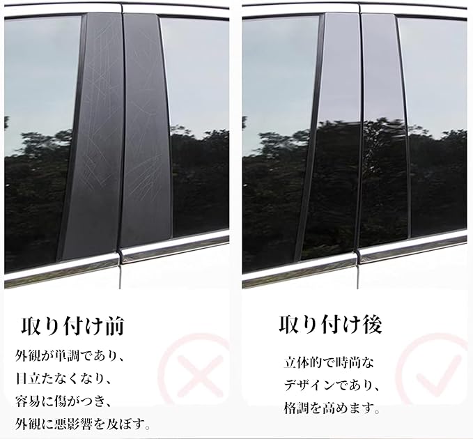 【取り付け簡単】:両面テープを使用して簡単に貼り付けることができます。女性の方でも簡単に取り付けることができます。取り付け後は洗練された印象が一層際立ち、車のグレードがアップし、鏡面仕上げが車体と見事に一体化します。