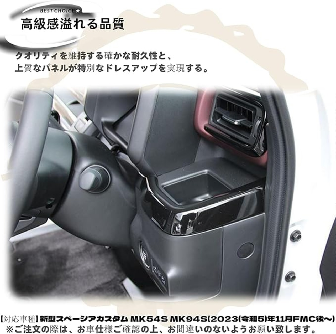 【本品は、2023年11月以降に生産されたスペーシア専用に設計された商品です。環境に優しいABS素材を使用し、安全で無毒、耐熱性・耐寒性に優れ、防水・絶縁性も備えており、長期間ご使用いただけます。実車のデータに基づいて設計されているため、元のカップホルダーに完璧にフィットし、既存の機能を妨げることなく、車内の質感を向上させます。取り付けは簡単で、工具不要で、取り付け面を清掃し、裏面の両面テープを剥がすだけでしっかり固定可能。シンプルで洗練されたデザインと高品質な仕上げが高級感を演出し、車内のインテリアと調和して、車全体の格調を高めます。