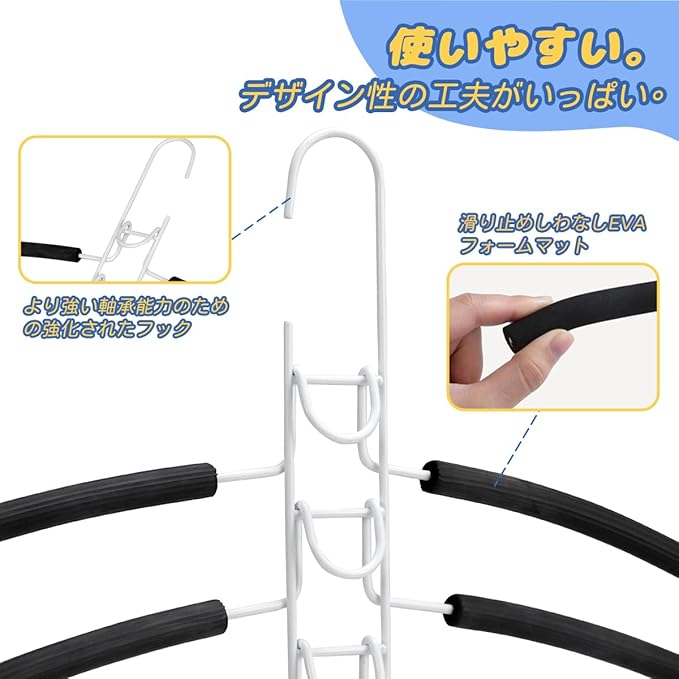 丈夫で耐久性抜群: 高品質な素材を使用しており、ハンガーは安定して耐久性があり、さまざまな重量の衣類を収納でき、長期間使用しても形が崩れません。