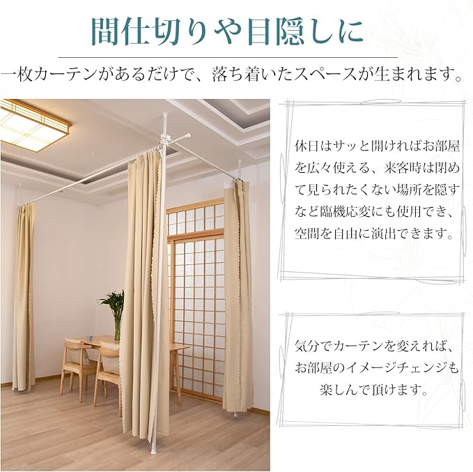 【間仕切りや目隠しに】賃貸住宅でも家を傷つけずに設置できるつっぱりシステムです。アイデア次第で自由に使いこなせる安定感と自由度の高さも魅力の一つ。間仕切りが不要になった場合でも、新たな用途で再利用することができます。