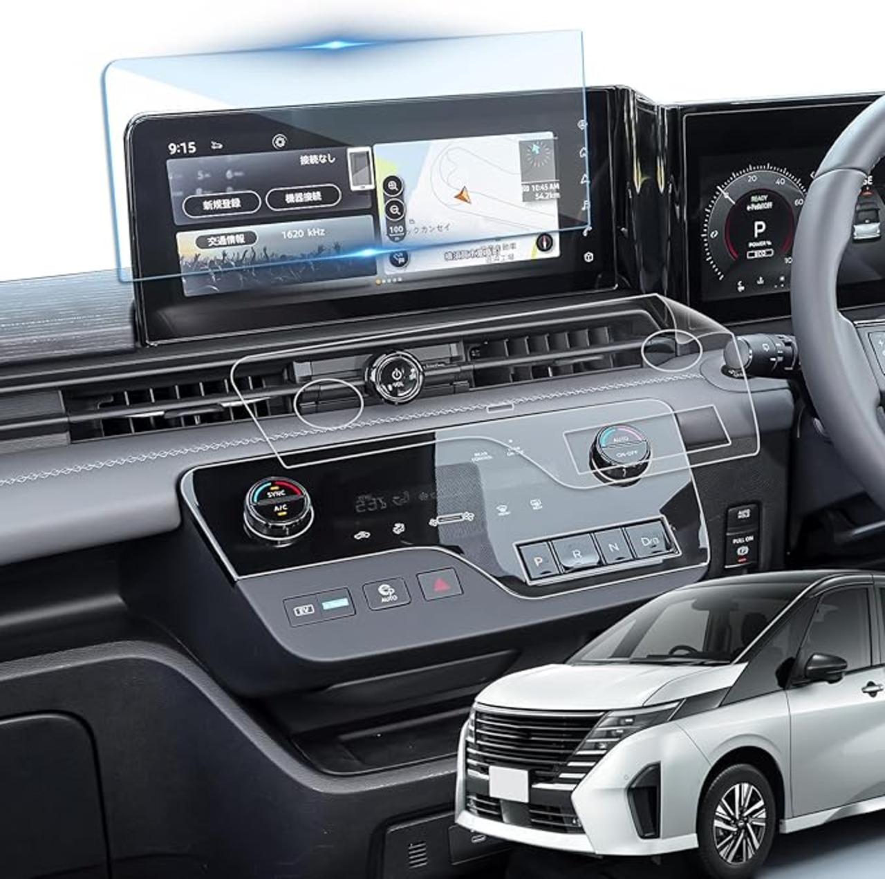 【対応車種】日産 セレナ C28 XV・LUXION ・ハイウェイスターV 年式:2022年-現行 エアコン+ 12.3インチ Nissan Connect ナビゲーションシステム対応用 (エアコンフィルムがAUTECH仕様には適用不可なので、ご注意ください。)【パッケージ内容】:エアコンフィルム 2枚、ナビフィルム 1枚、気泡抜きヘラ、クリーニングキット(ウェットワイプ、クリーニングクロス、ホコリ除去シール)