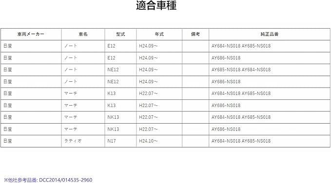 【適合車種】:ノート E12系 、 NE12(H24.09~R2.12) 、マーチ K13系 / NK13 (H22.07~)、 ラティオ N17 (H24.10~)