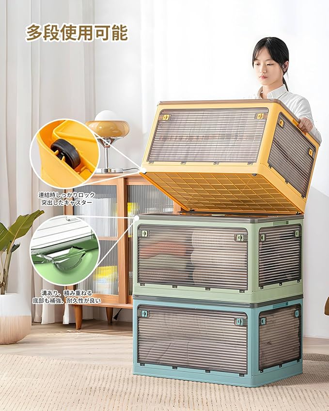 【キャスター付き 移動便利】収納ボックス 折り畳みの底面にはキャスターが付いており、たくさん入れても重くなっても、力の弱い女性や子供でも楽に移動できます。 伝統的なキャビネットと比べても移動が容易です。ボックスの両端にはたくさん入れてもしっかりと運べる取っ手が付いているので、掃除や配置変更の際にも移動が簡単です。キャスターを取り外して水平に置いても使用可能です。
