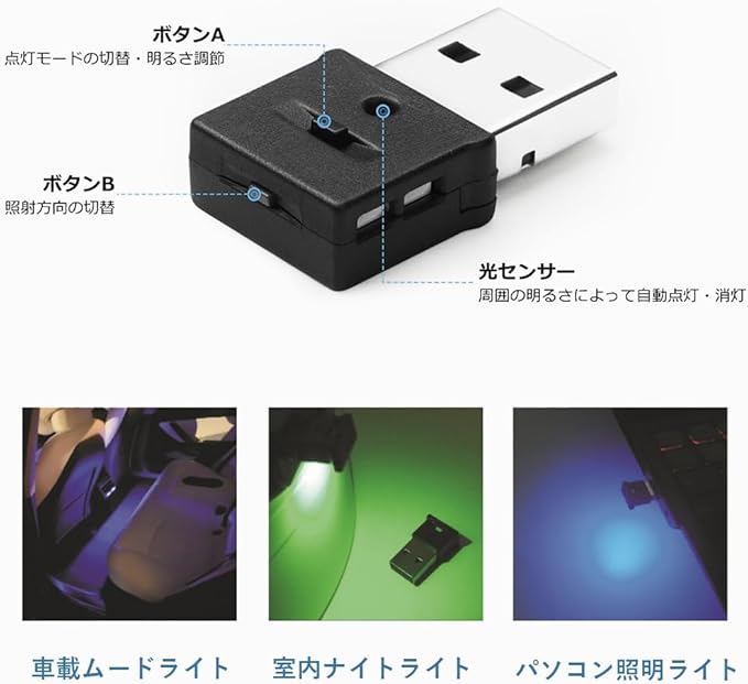 柔軟な取り付け方法:LEDライトは照射方向を切り替えることで、異なる車種やc型USBポートの取り付け方向に適しており、ユーザーの多様なニーズに対応します。