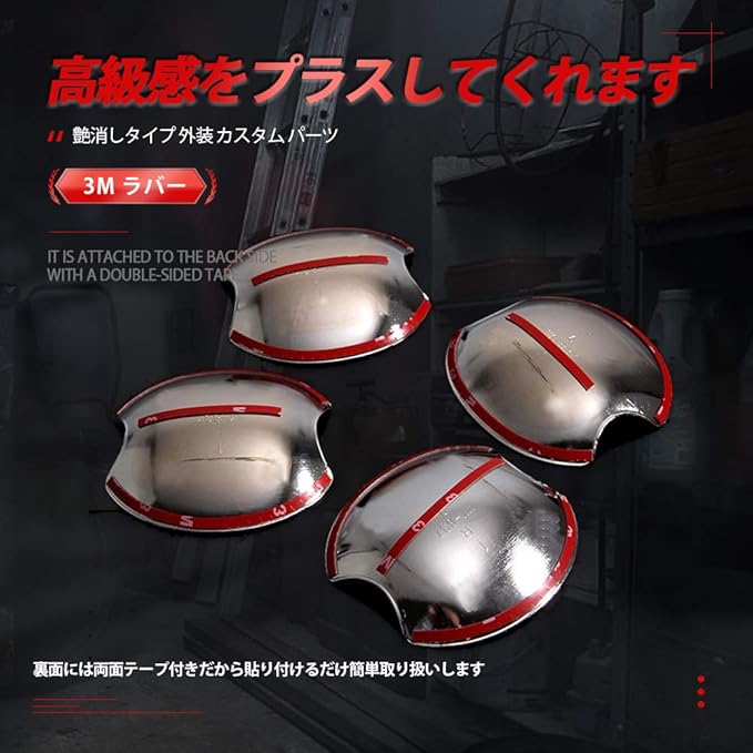 【高級感溢れる見た目】:純正の艶消し銀色ハンドルとは違って、本製品は表面を鏡面シルバーメッキ を施したピカピカしてるドアハンドルカバーなのだ。これをつければ車自体の質感を高め、より高級感 のあるように見える。
