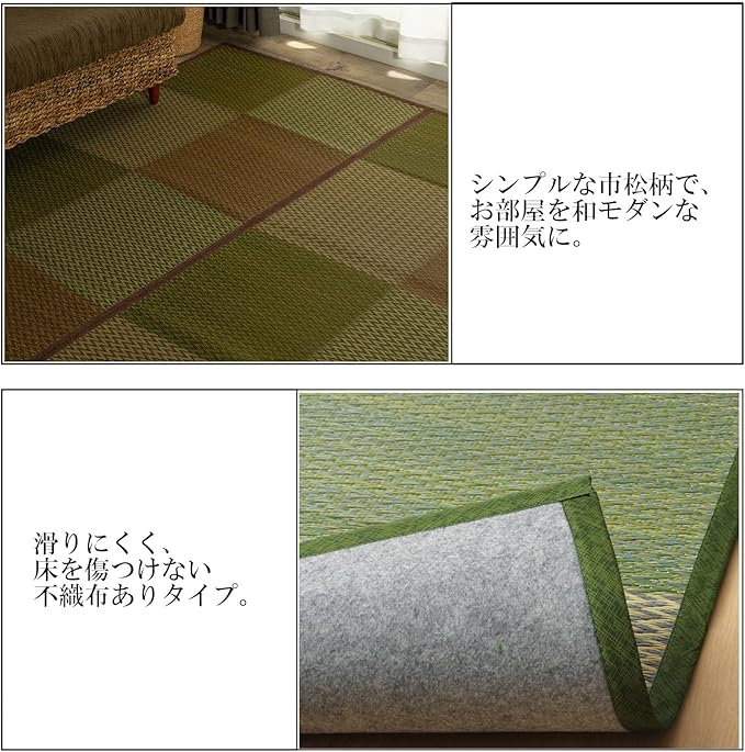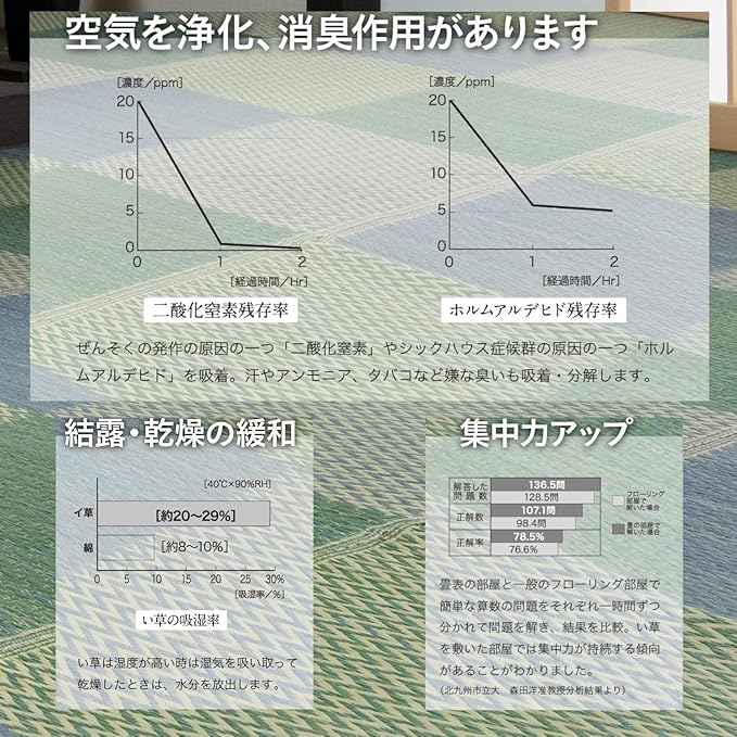 【清潔な空間を】い草には空気の清浄作用、湿度の調整作用があり、汚れにくいといった特徴があります。敷くだけで畳のお部屋をリフレッシュできます。