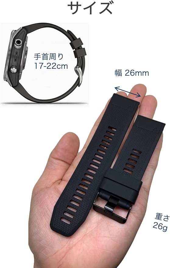 Garmin fenix 交換バンド enduro / TACTIX DELTA / Fenix 6X GPS / Fenix 6X PRO / Fenix 6X Sapphire GPS / fenix 5x Sapphire / fenix5x GPS / fenix5x plus / fenix3 / fenix3 hr / fenix3 sapphire / d2 bravo / quaitx3 / descent mk1 / descent mk2 / descent mk2i 対応 手首周り 17 - 22cm 対応(幅26mm) 工具付き Garmin fenix 交換バンド 26mm 黒 シリコン 防水 互換 Fenix 5X / Fenix 5X plus / Fenix 3 / Fenix 3 HR 対応 工具付き ガーミン ベルト 交換 予備 消耗