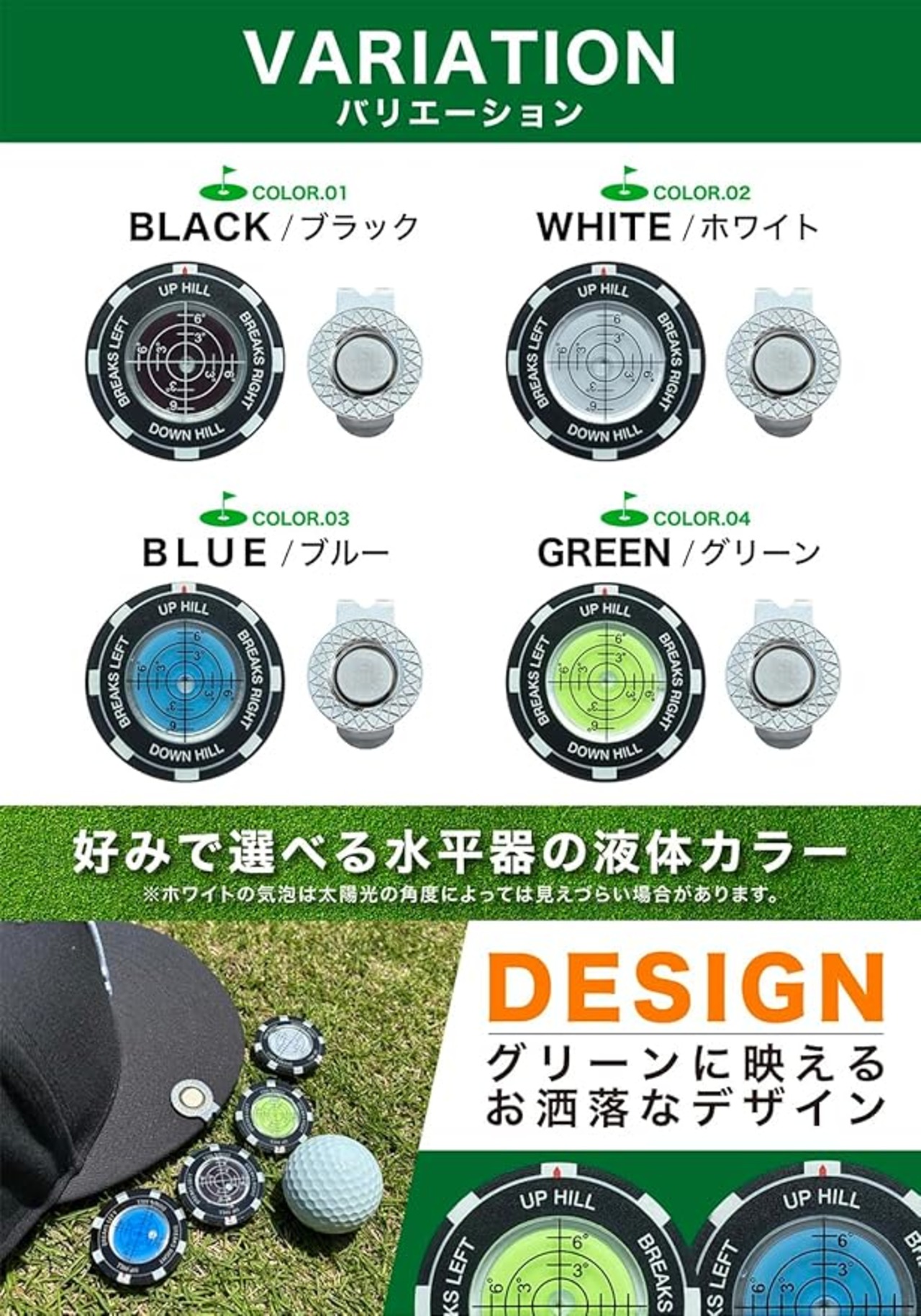 【デザイン性】スタイリッシュで洗練されたデザイン、グリーン上でも程よく目立つマーカーです