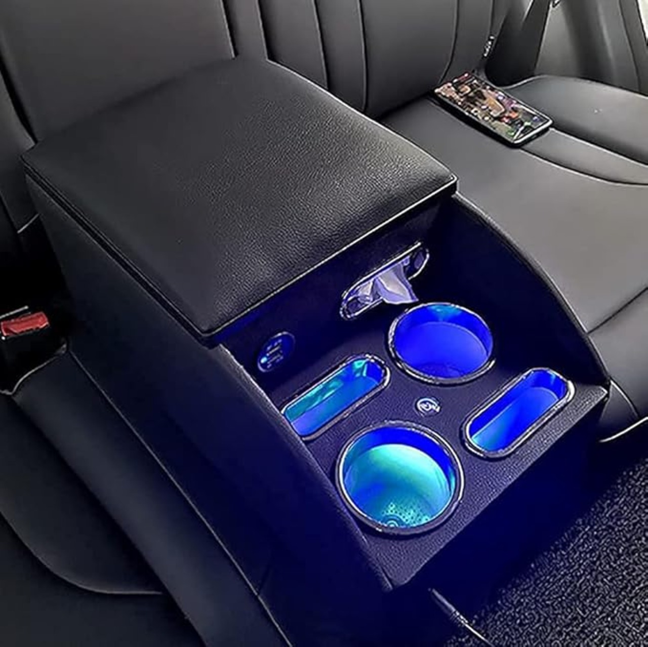 【高級感】リアシートのセンターに置くだけで高級セダンのような快適性をプラス。上質なPVCレザーはアームレストとして快適にご利用いただけます。PVCレザーとLED照明、艶のあるブラックABS樹脂とシルバーメッキの相乗効果で内装のグレード感がアップし、ラグジュアリーな車内空間を演出します。