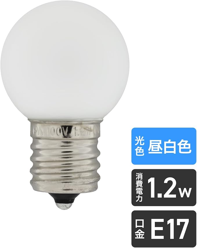 ■交流電源:100V 50/60Hz共用 ■口金:E17 ■サイズ:全長48X外径30(mm) ■質量:11g ■定格消費電力:1.2W ■定格入力電流:0.014A ■設計寿命:30,000時間 ■全光束:55lm ■光色:昼白色相当 ■屋内用