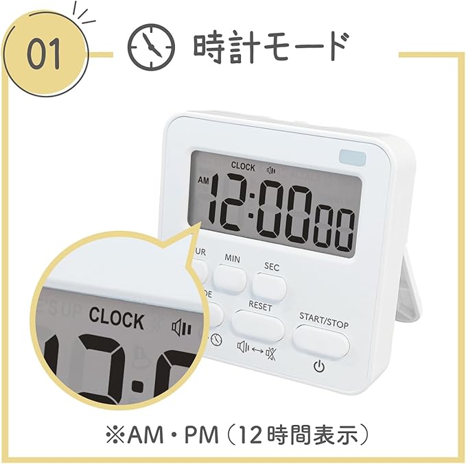 ・時計モード(AM・PM表示)、タイマーモード(カウントアップ・カウントダウン)の機能付き