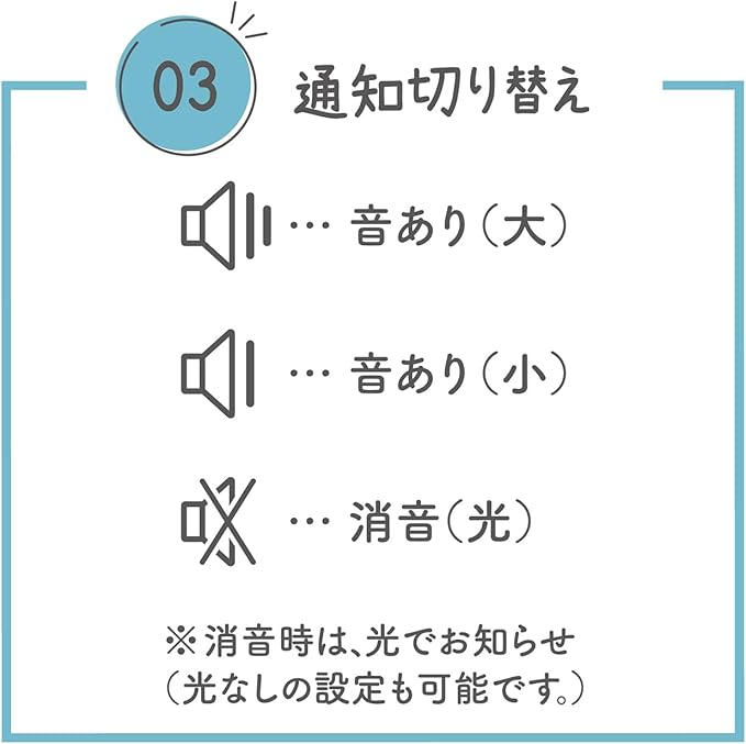 【特徴2】4種類の通知設定あり(通知音大・小、光、消音)