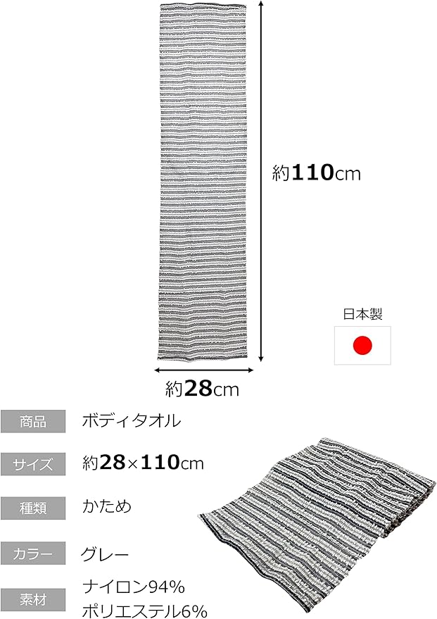 サンファブレス Ag メンズ ボディタオル かため グレー からだ洗い 泡洗い 防臭 抗菌 約28 110cm 日本製
