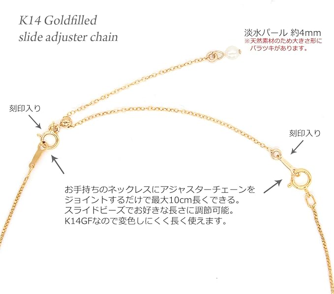 【便利なアジャスターチェーン】お手持ちのネックレスを長くできる、取り外し簡単の後付けアジャスター。アジャスター本体のチェーンに付いた玉の部分を押さえてチェーンをスライドさせることで、お好みの長さに調整できます。服装に合わせて長さを変更することで、同じネックレスでも全く違う表情に。夏は素肌に、冬はニットの上にと、長さのアレンジによってコーディネートの幅が広がります。