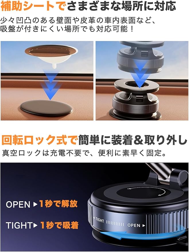 ✅【強力なMagSafe固定機能】スマートフォンの固定はMag-Safeマグネットで行い、付属のメタルプレートを使用することで、非Mag-Safe対応の機種でも利用可能です。用途や設置場所に応じて、Mag-Safeマグネットによる固定と真空吸着を使い分けることができます。