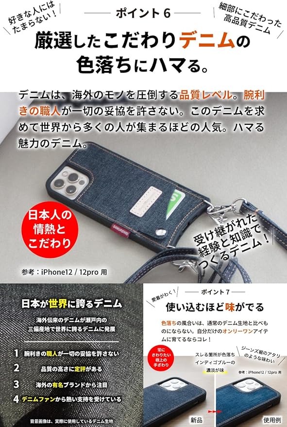 【デニム好きには、たまらない】あなただけの色落ちを楽しむ。 肩掛けやショルダー使いもできる機能性が秀逸な大人の演出を作り出すスマホケース。バッグやポケットから出す煩わしさから解放。最近は、スマホで支払いすることも多いが、両手フリーに動けるので荷物が多いときや、子連れのときなど最高。メイン素材が世界でも名高い日本製デニムから厳選したデニム生地で手触りがたまらない。 安っぽいモノは嫌!というあなたにピッタリ見られて恥ずかしくないオシャレ大人に似合う携帯ケース。 ストラップを手首に通せば手持ちでも落ちる心配なし。両手フリーにする洗練されたコーデに相性が良く、斜めがけはもちろん肩掛けを外して使うのもOK。 付属している肩掛け紐とストラップで利用シーンに合わせて付け替えしてどのようなときも落下の心配なし。 室内での使いやすさだけでなく、通勤、通学、ピジネス、旅行、出張に大活躍のアクディブなあなたの求めるスマホケース。