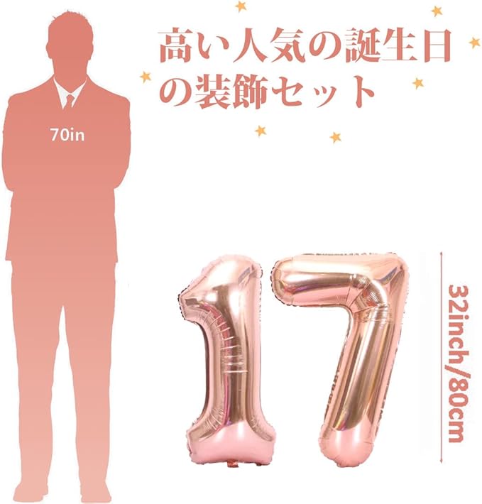 【セット内容】①「17」バルーン ②「HAPPY BIRTHDAY」ホイルバナー ③ハート風船 4 ④星風船 4 ⑤シルバー風船 12 ⑥ブルー風船 12 ⑦紙吹雪風船 12 ⑧ 空気ポンプ 1、ドット状両面テープ 2、銀色リボン 2