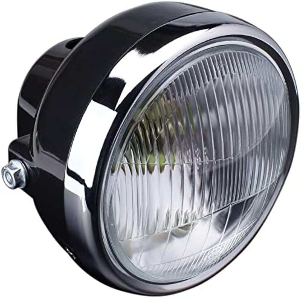 モンキーやエイプなどの4ミニをはじめとする小型のバイクに最適なヘッドライトです。 ハロゲン球とポジション球付き。 ヘッドライト取付ボルト間は155mmで多くの単車に対応し、取付ボルトもM8が付属されていま す。 ボディ上には直径25mmの穴が設けられているので、メーターなどの設置も可能です。