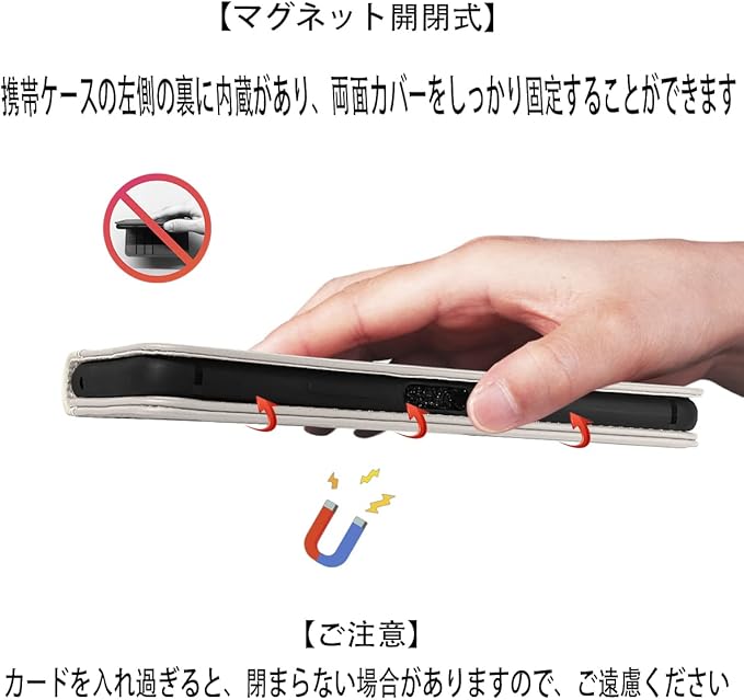 【多機能】 ①{スタンド機能が付いて}:横向いて斜めに立てて、お好きな角度を調整できます。 ②{マグネット開閉式}:携帯ケースの左側の裏に内蔵があり、両面カバーをしっかり固定することができます。 ③{カードポケット付き}:内側に3つカードポケット、車券と名刺などに便利なカードスロット、小銭など挿入可能サイドポケット、ちょっとしたお出かけにもこれ一つで、財布型ケースとして、名刺やお札などを入れるカードポケットがつき、日常生活に便利です。ただし、カードを入れ過ぎると、閉まらない場合がありますので、ご遠慮ください。