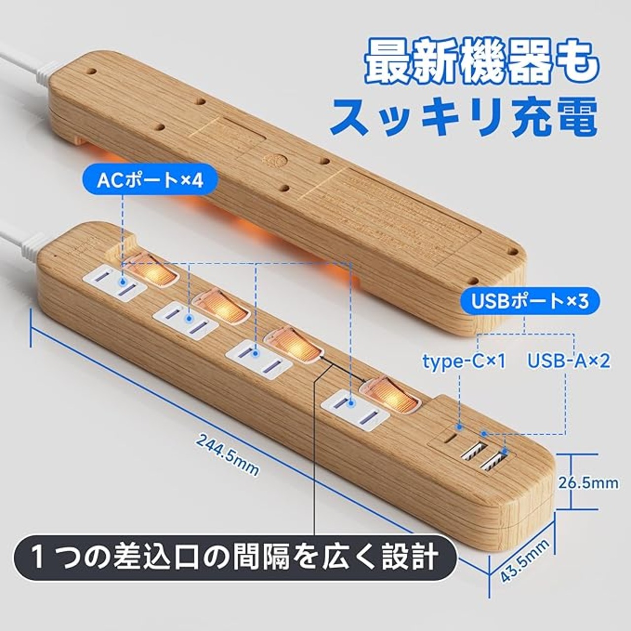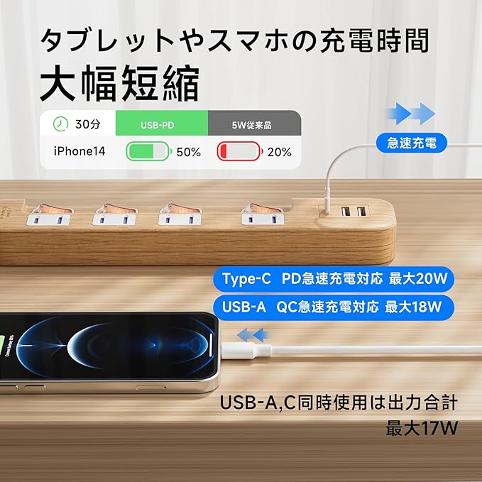 「USB3ポート」Type-C+USB-A2種類のUSBポートを搭載しました。アダプタ要らずでUSB充電ができるので、省スペースでスッキリ。Type-CはPD20W対応、iPhone等最新スマートフォン充電との相性抜群。USB-AはQC3.0対応、 Android機器と相性抜群。接続機器を自動検知し、最適な充電を行う【スマートIC】が充電時間のロスを抑え、過電流や過充電を防いでくれます。最新スマホ、タブレット、ワイヤレスイヤホンなど、USB充電を快適にしてくれる製品です。