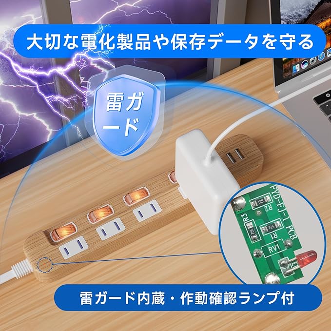 「雷から保護」雷ガード搭載。最大電圧6000Vの高性能雷サージ吸収素子(バリスタ)を内蔵し、雷による電圧や過電流を軽減します。落雷によって瞬間的に発生するダメージによる接続機器や保存データを守ります。※作動確認ランプ付