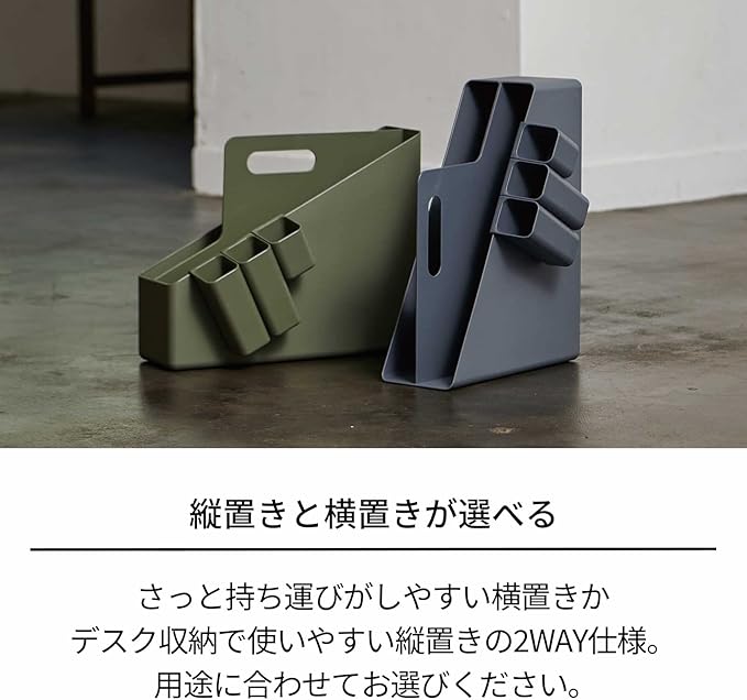 書類やデスク周り文具などを、ひとまとめにして持ち運びできる取っ手付きのファイルボックスです。 また横置きと縦置きの2種類の使用方法が可能なので用途によってお選びいただけます。