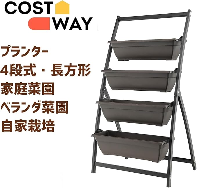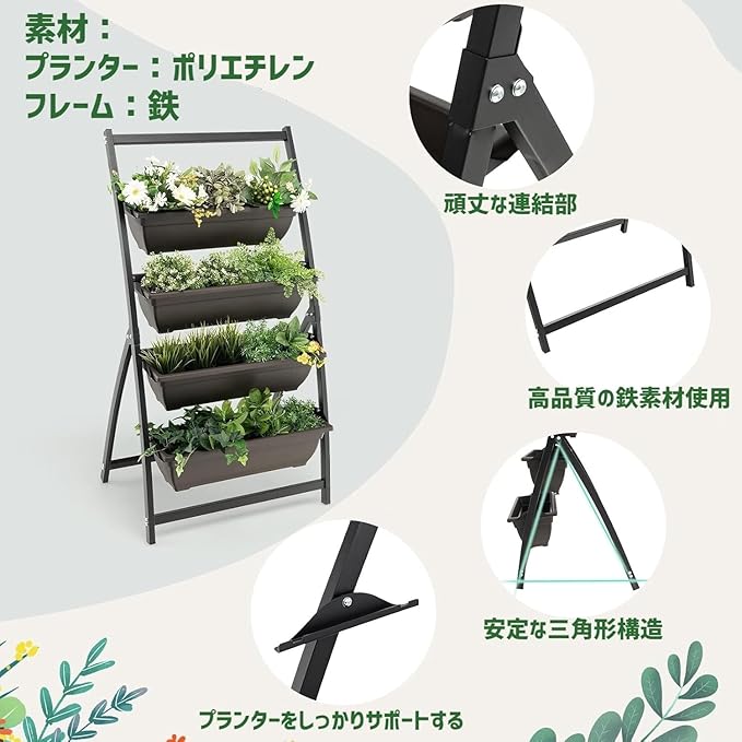 4段式で、4個のプランターが付属されていて、十分な栽培スペースが提供されます。野菜や果物、花など幅広い種類の植物を栽培することができます。