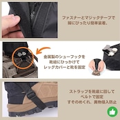 ✅【⭐巻きつけタイプだからかんたん装着⭐】5ステップで簡単フィット!①ふくらはぎに巻く、②ファスナーを閉め、マジックテープを止める、③シューズフックを靴ひもにかけてズレ防止、④ストラップを靴底に回し、しっかりホールド、⑤ふくらはぎのドローコードを絞ってフィット感を調整。しっかりフィットするのに締めつけ感がなく、長時間の移動でも快適。アウトドアの過酷な環境でもずれにくく、日常使いでもストレスフリーな履き心地です。