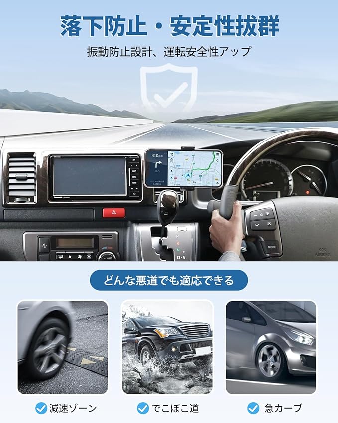4.【安定感バッチリ&落下防止】:自転車用スマホホルダーは強化された伸縮システム及び分厚い四隅固定設計を採用し、一般のスマホホルダーよりさらに安定しているだけでなく、スマートフォンもしっかりロックし、ご大切な携帯電話を落下によるダメージから守れます。【取付簡単】:ハイエース専用のスマホステーをダッシュボードの取付位置を差し込んだら、組み立てるだけなので、簡単に設置できる他、ロングアームでレバー等の干渉を避け、見やすい位置へ調整可能です。