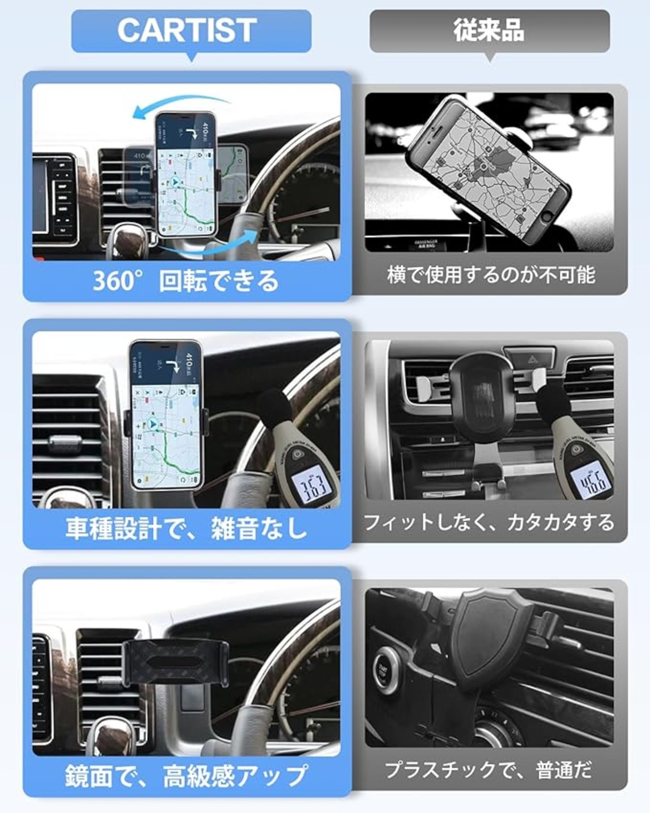 3.『360度回転』スマホ本体を固定する部分は360度回転できますので、ご愛車や個人ににより、一番良い位置に調整した後、固定できます。【全機種対応】本製品はコンパクトと機能性を兼ね揃えた車載ホルダーで、スマホホルダーの幅は50mmから90mmまで拡張ができ、ほとんどのスマートフォンに対応しています。iPhone 13 / iPhone 12 / iPhone 11 / 11 Pro / XR / iPhone X / XS / XS MAX / iPhone 8 Plus / 8 / SE / SE 2 / 7 Plus / 7 / 6 Plus / 6、または Galaxy S8 / S8 Plus / huawei / Xiao Mi / Xperia / Google Pixelなど全機種に対応できます。