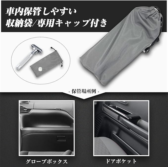 ●緊急時にドアや窓が開かない際に、サイドガラスを割って車から脱出する道具です。