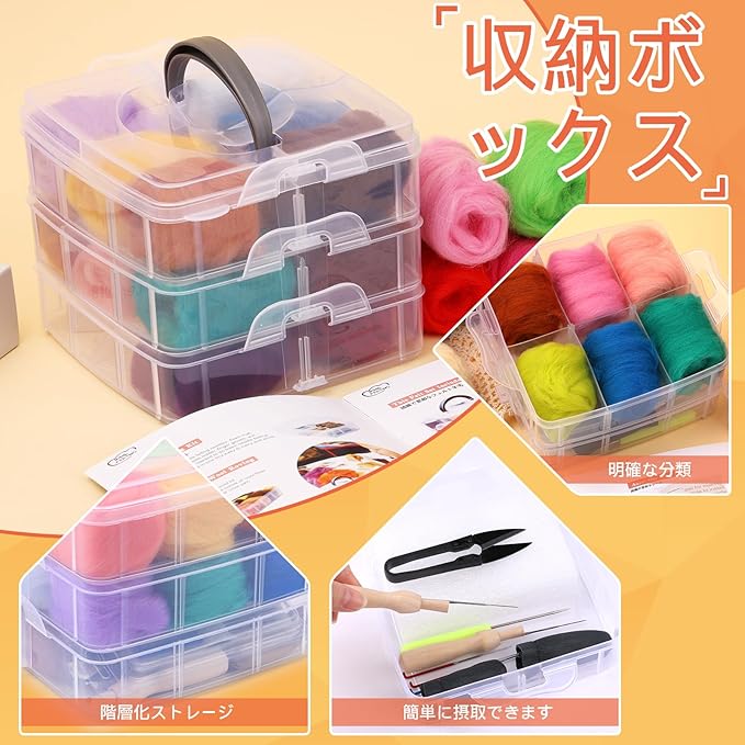 羊毛フェルト キット 初心者: フェルトニードル、握り鋏、指サック、木製ニードルホルダーなどの数十種類のツールが付いた羊毛フェルト道具なので大人まで楽しめる手芸制作基本入門キットです。練習、色の組み合わせなどなど作品の装飾などに活かせます。この1手芸フェルト セットで、すぐ手芸フェルトを始められます。可愛いフェルト作品をたくさん作れます!