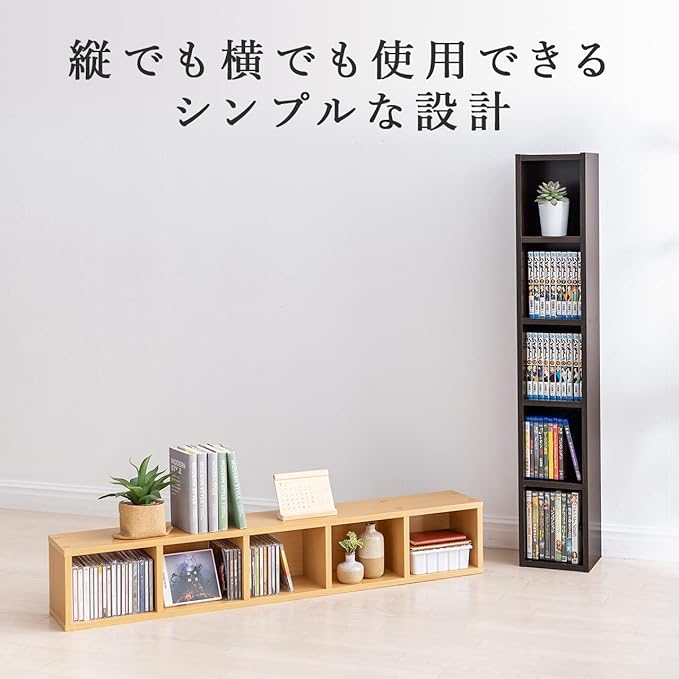 シンプルなデザインの5段式メディアラック。縦でも横でも使用でき、机の横や天板に置いて使用できるスリムなメディア収納ラック。CDプラケースやDVDトールケースの収納の他、脱衣所や玄関の隙間に小物を収納して使用できるマルチラック。木製。