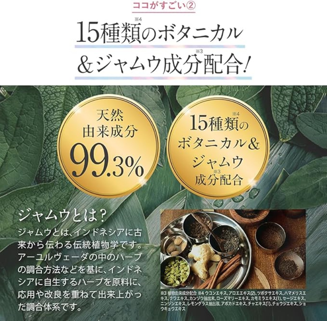 ✅【15種類のボタニカル&ジャムウ成分配合】ウコンエキスやアロエエキスなど、自然由来の成分を配合。肌に優しく、全身に使用できます。