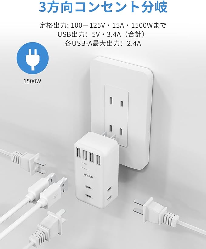 Mscien 電源タップ usb 雷ガード コンセントタップ 3個AC口 4個USBポート たこあしコンセント タコ足コンセント 直挿し 分岐 マルチタップ